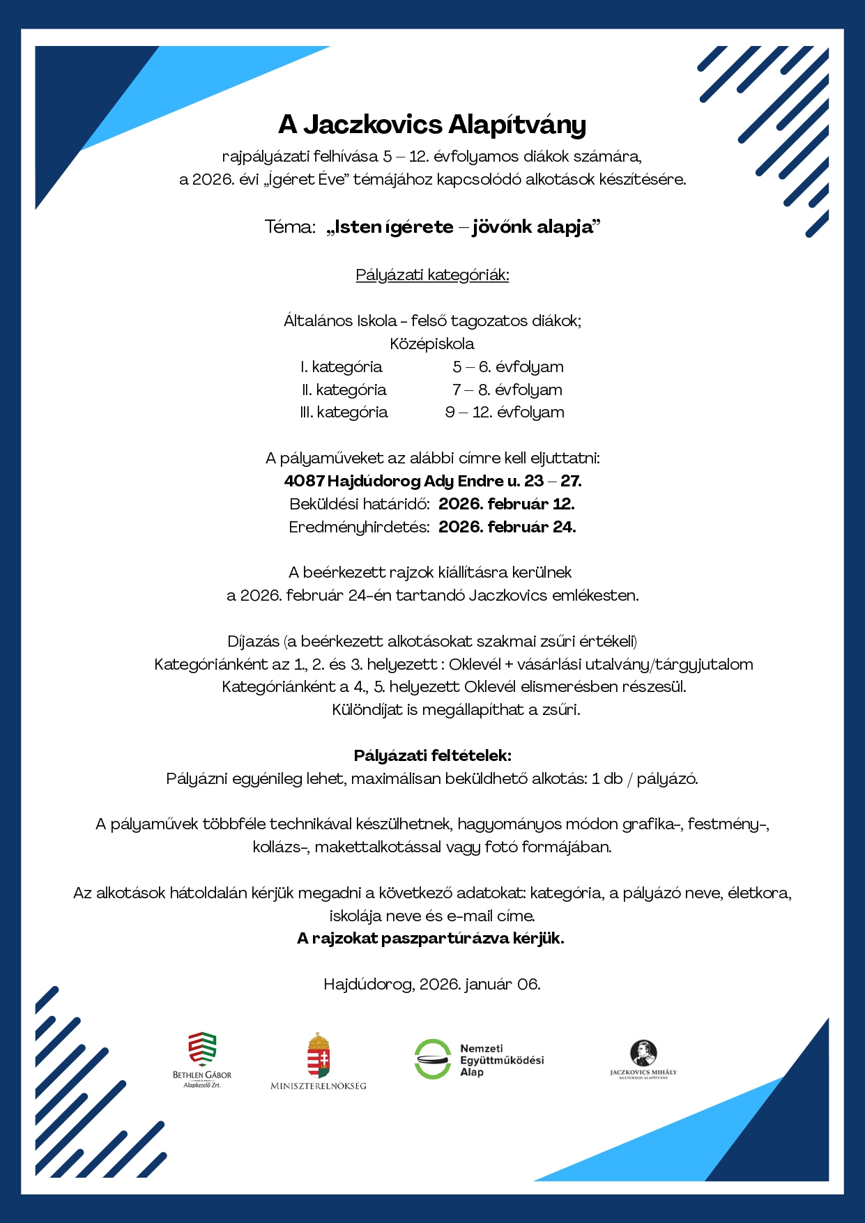 A beérkezett rajzok kiállításra kerülnek a 2026. február 24-én tartandó Jaczkovics emlékesten.
