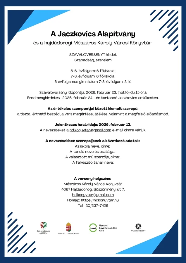 A Jaczkovics Mihály Kulturális Alapítvány és a hajdúdrogi Mészáros Városi Könyvtár Szavalóversenyt hirdet.